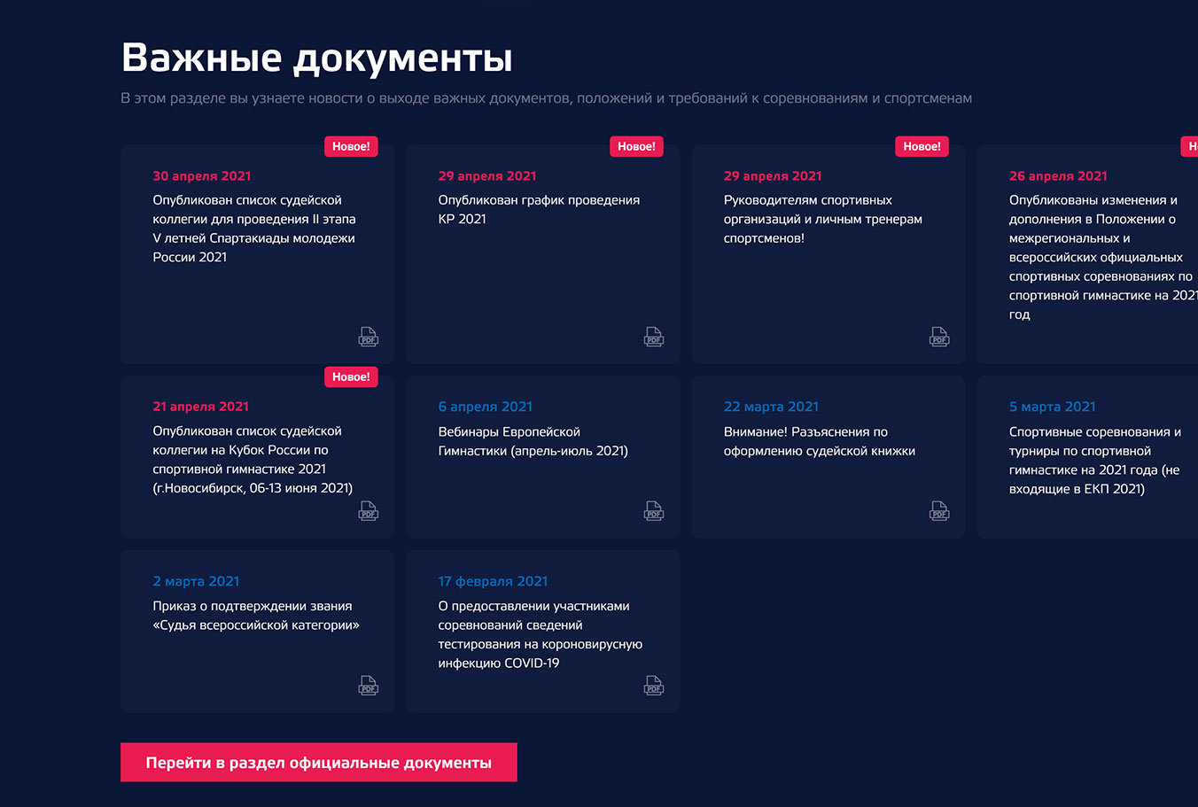 Теперь узнавать о выходе новых документов, требованиях- стало намного проще. Мы создали отдельный новостной раздел, посвященный выходу важных документов и требований, а также переработали полностью раздел, посвященный официальным документам федерации.