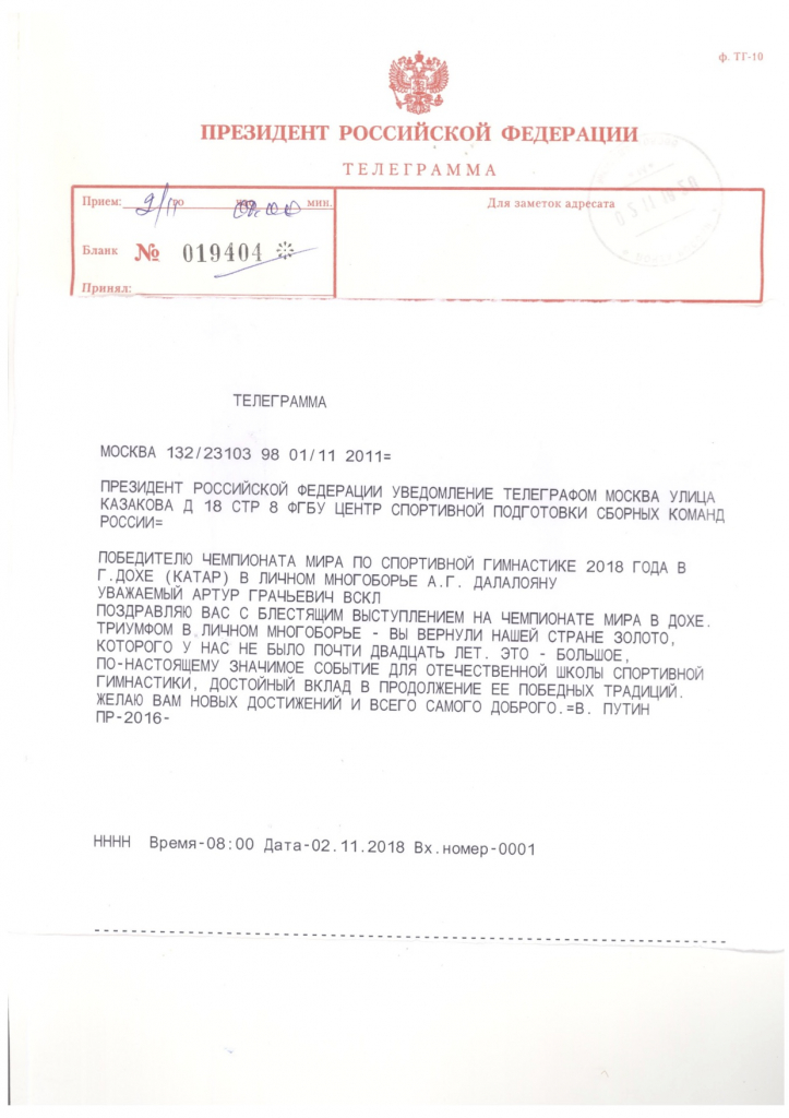 Поздравительная телеграмма от Президента РФ Путина В.В. в адрес Далалояна А.